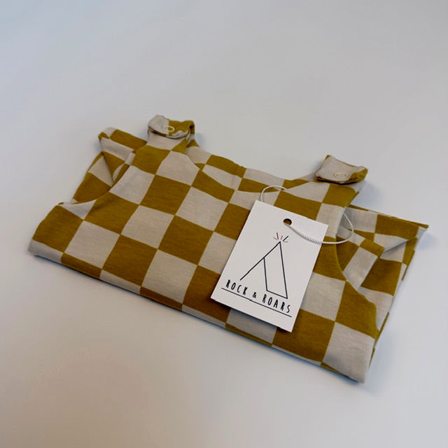 This listing is for one Mustard Checkerboard harem romper, as shown in photos - size to be selected.