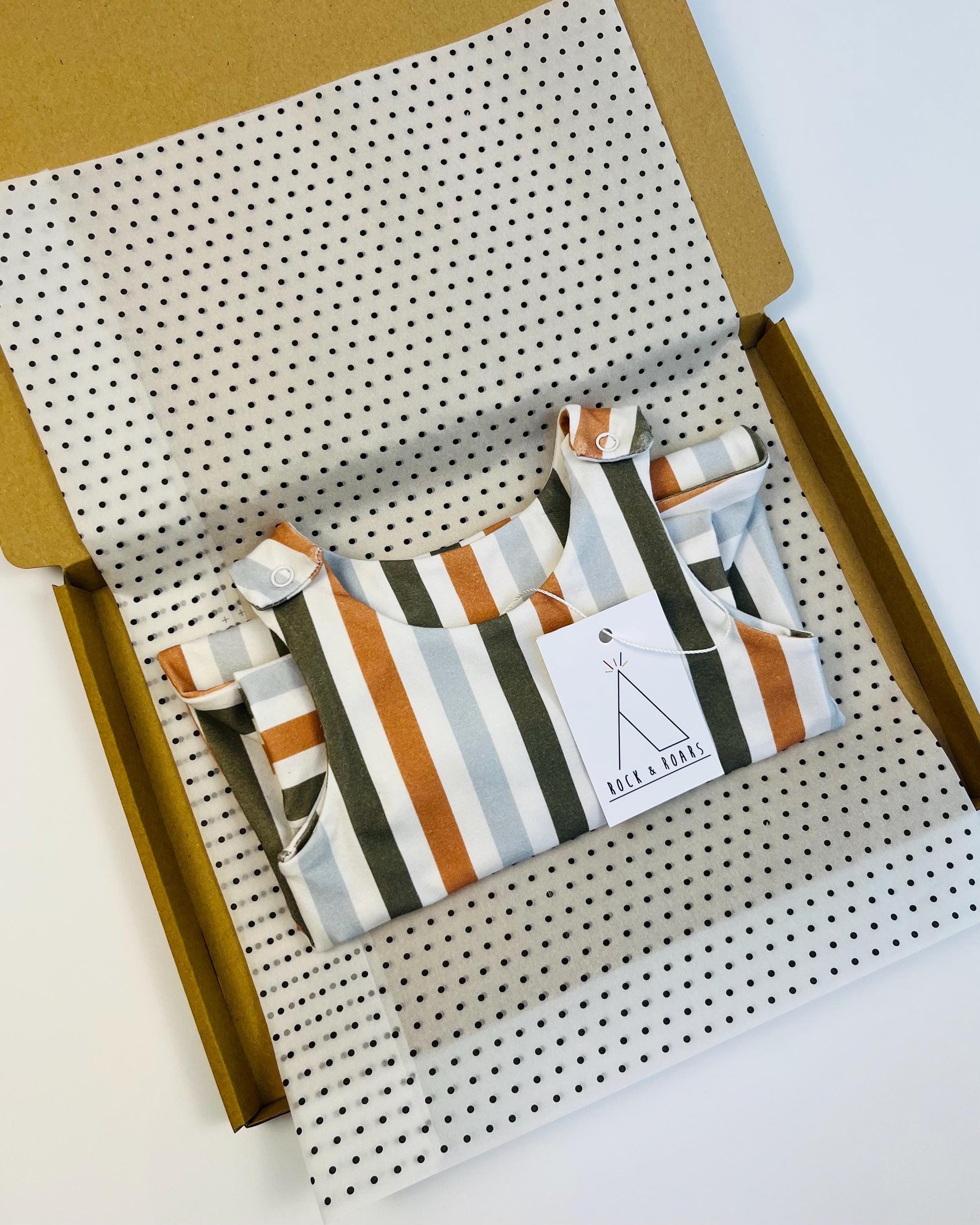 Our rompers are designed to be loose-fitting to allow little adventurers to move, climb and play in comfort! The dropped crotch design allows for both disposable and cloth nappies and the romper is finished with snap fasteners.